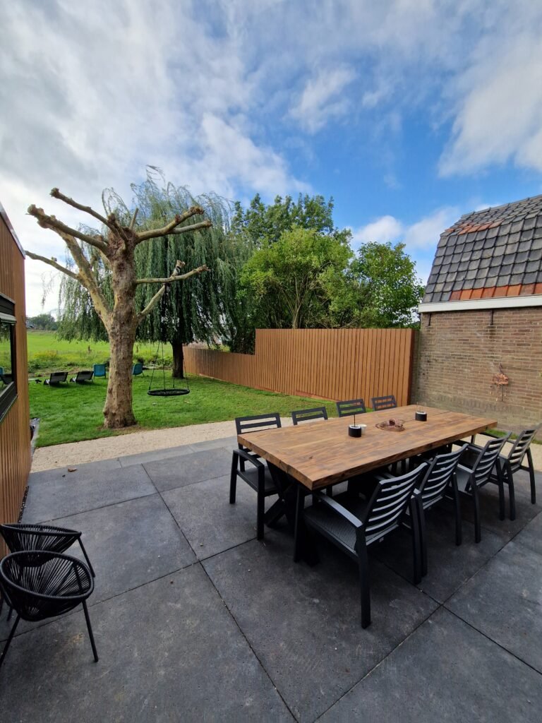 Tegen de woning is er gekozen voor een schellevis tegel met een afmeting van 120x120cm. De uitdaging om deze in de achtertuin te krijgen is doorstaan, en het resultaat mag er zijn!
